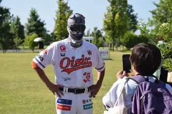 動物の覆面姿でファンの撮影に応じるオイシックス・武田監督