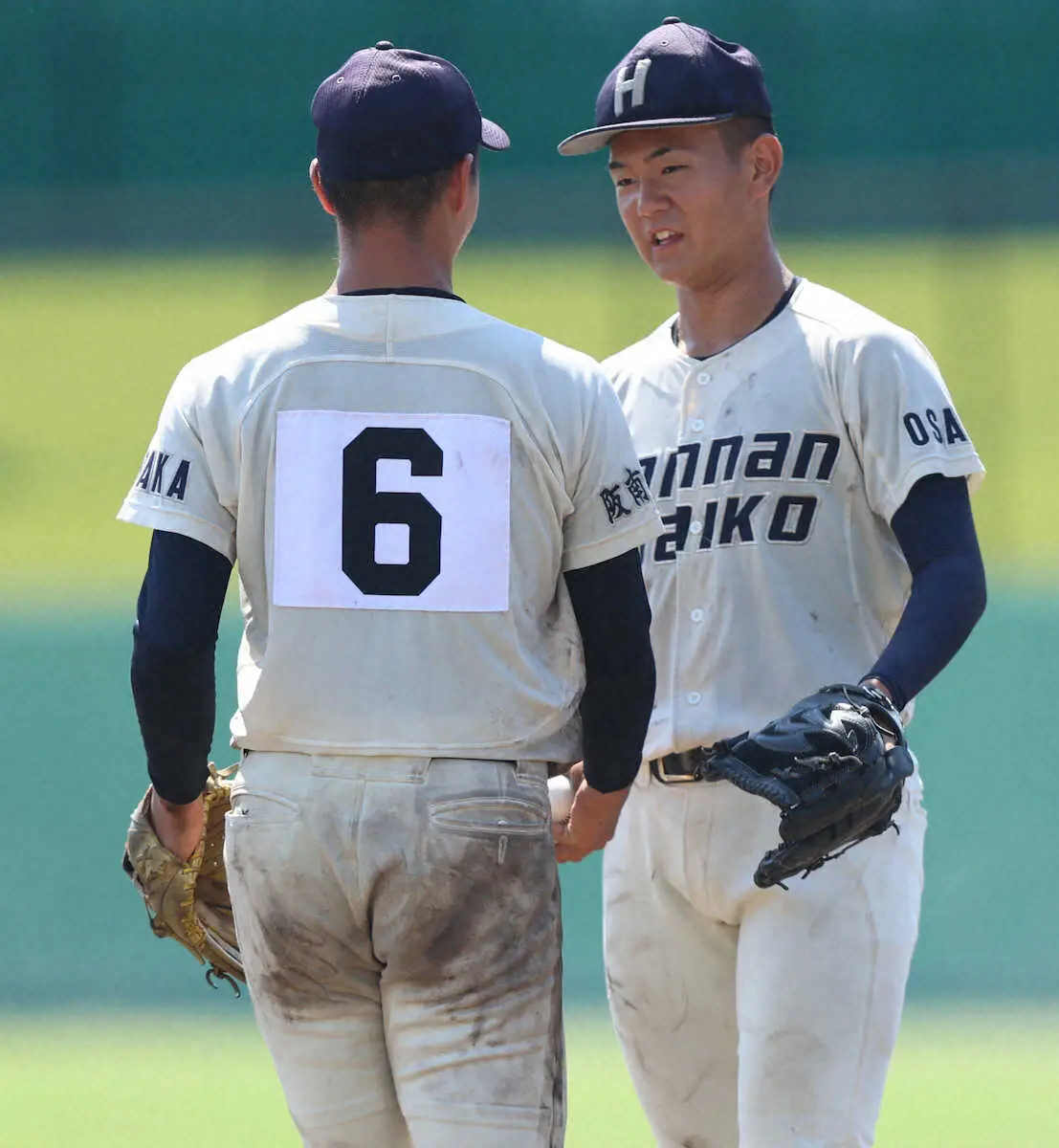 <大阪予選 阪南大校・履正社>7回、2失点でマウンドを譲る阪南大校・入来(右)(撮影・中辻 颯太)