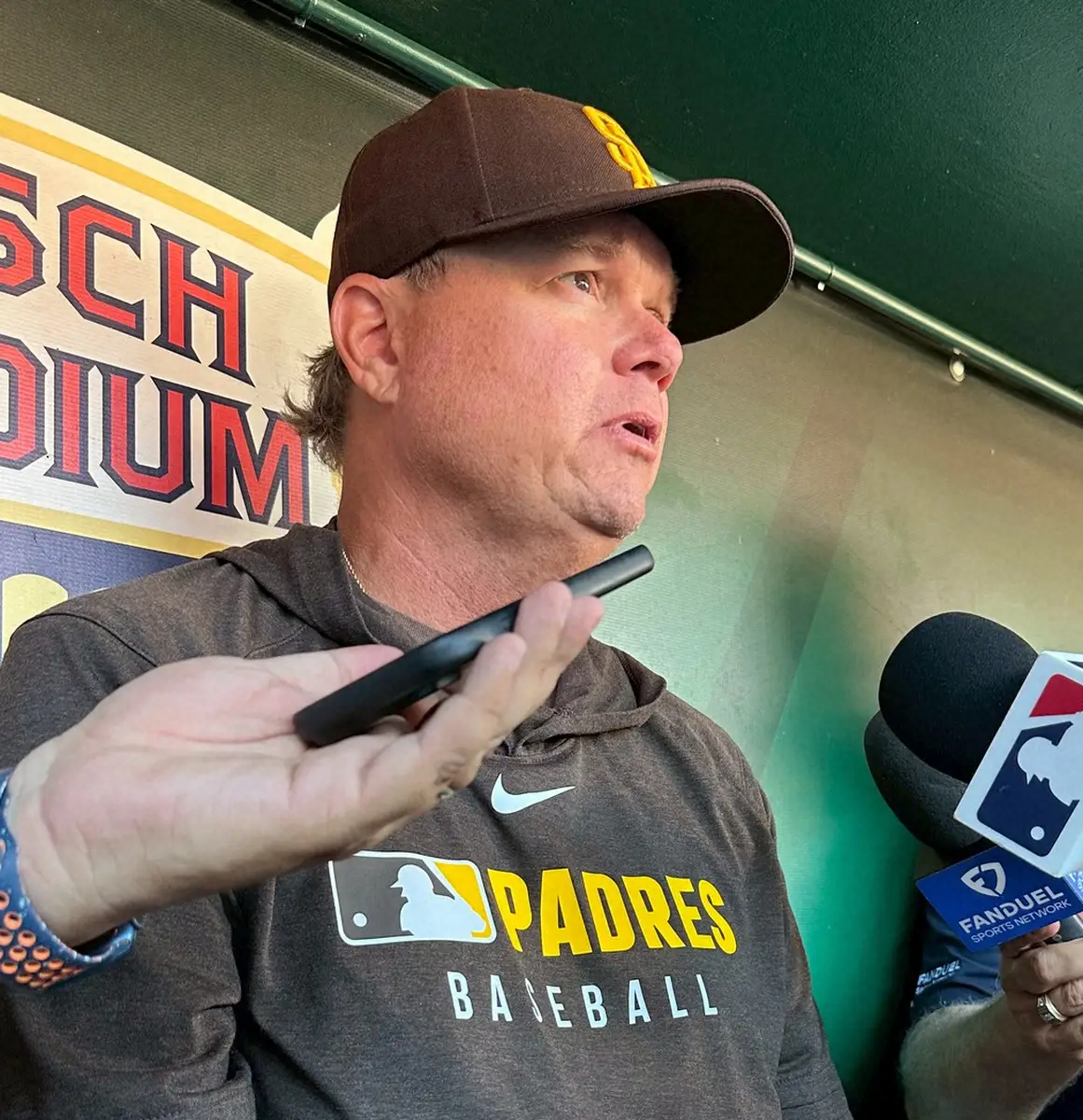 パドレス 試合前の取材に応じるマイク・シルト監督(撮影・笹田 幸嗣通信員)