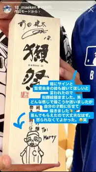 さらに「箱のサインと監督自身の絵も描いてほしいと言われたので似顔絵描きました。笑」と獺祭の箱のアップ画像も投稿。「どんな感じで描こうか迷いましたが自分の才能に任せて描きました」と“画伯”としての才能を発揮したと報告。続けて「喜んでもらえたので大丈夫なはず。怒られなくてよかった。笑」と記した。