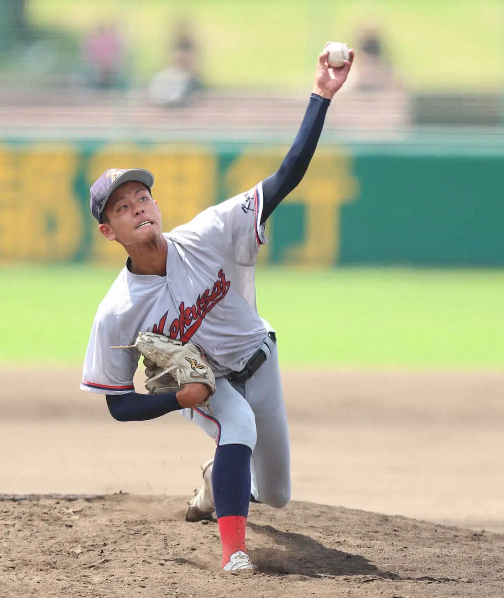 3試合連続の先発登板。今夏初登板だった4回戦・京都共栄学園戦の初回からこの日の5回まで21イニング連続奪三振を記録した。「低めに決まった」と明かす得意球チェンジアップは最遅が99キロ。最大47キロの球速差を生かして惑わせた。ノーシードでの出場となった昨夏日本一校が、2年連続の夏の甲子園出場に王手。エース左腕は「あと1試合、気合で乗り切ります」と誓った。 (河合 洋介)