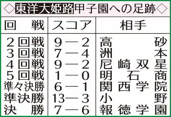 第107回全国高校野球選手権大会(8月5日開幕、甲子園)の地方大会決勝が28日、各地で行われた。兵庫大会では東洋大姫路が7―6で報徳学園を破り、2011年以来14年ぶり13度目となる夏の甲子園出場を決めた。兵庫大会での秋春夏3連覇は1955~56年県尼崎、2001~02年報徳学園、18~19年明石商に次ぐ史上4校目。今春選抜準優勝の智弁和歌山(和歌山)も2年連続28度目の夏切符をつかんだ。