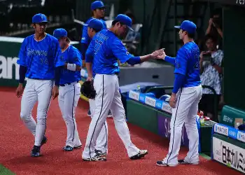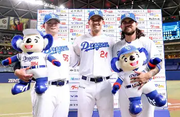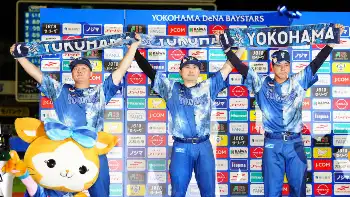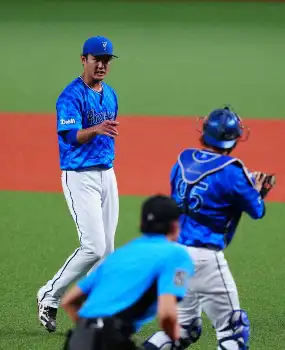 イースタン・リーグ<西・D>初回、無失点で抑え、チームメートに迎えられるDeNAの先発・藤浪(中央)=撮影・木村 揚輔