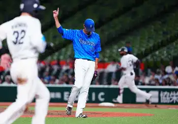 イースタン・リーグ<西・D>2回、この回を無失点で抑え、左翼手を称えるDeNAの先発・藤浪(撮影・木村 揚輔)