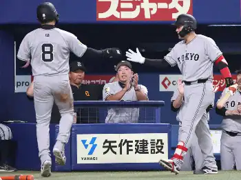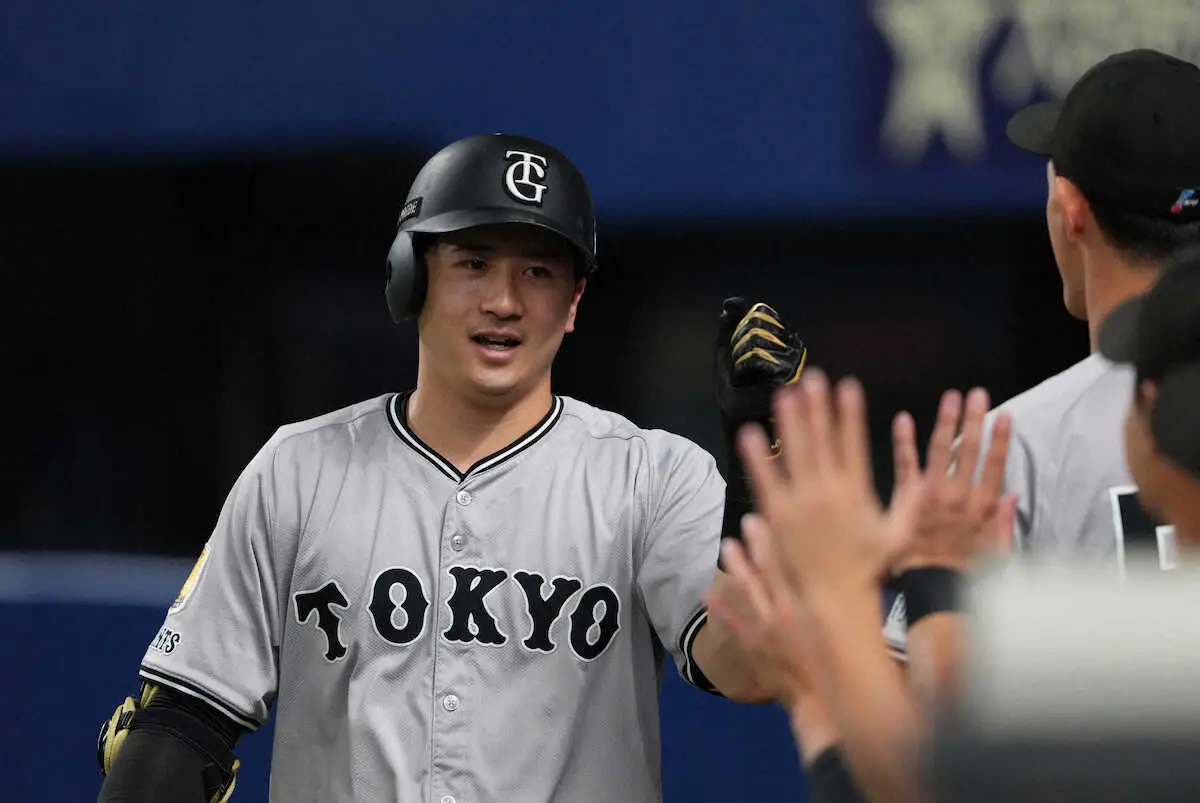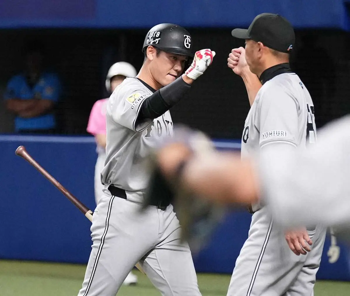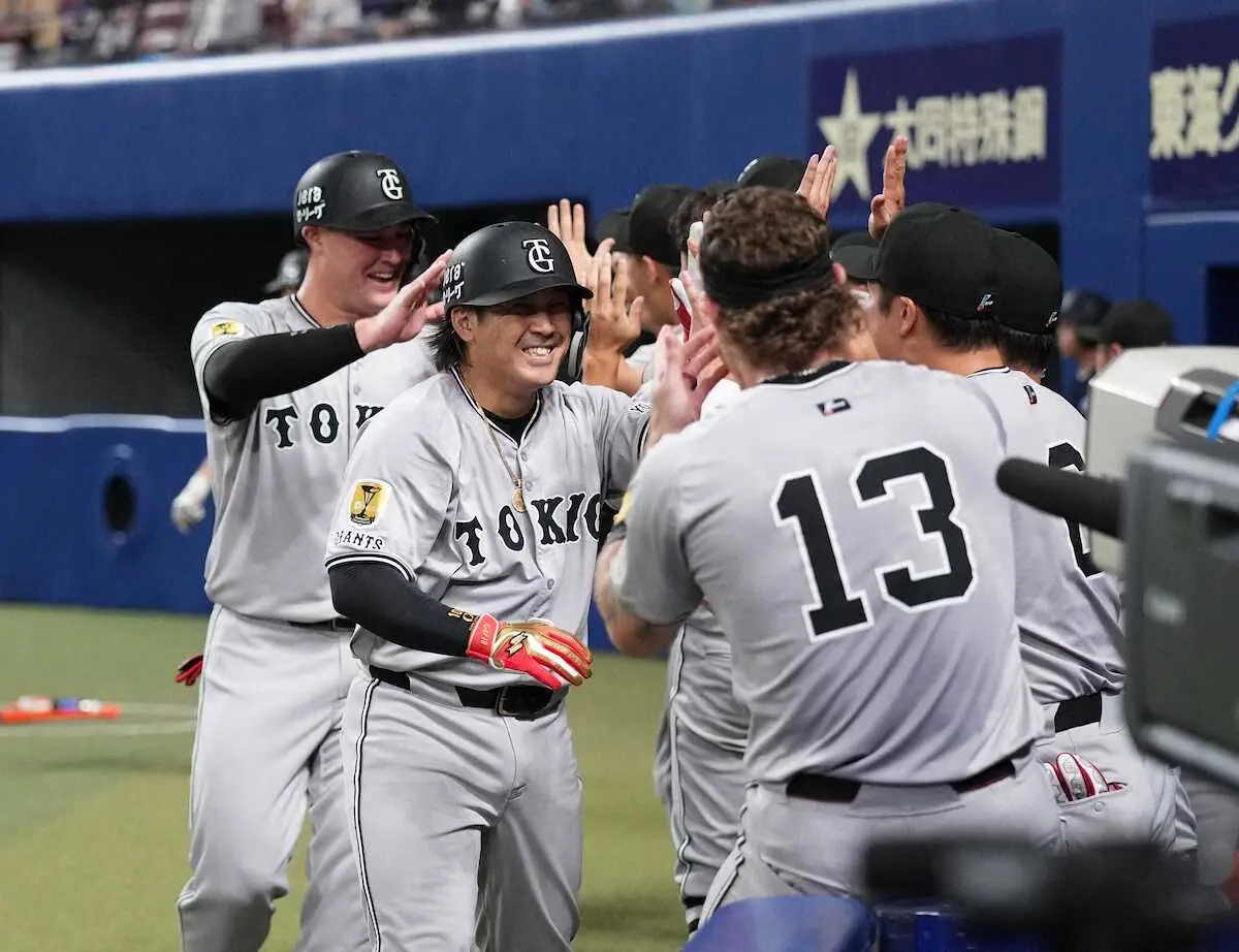 <中・巨(16)>初回、先制犠飛を放った泉口はナインの出迎えに笑顔(撮影・沢田 明徳)