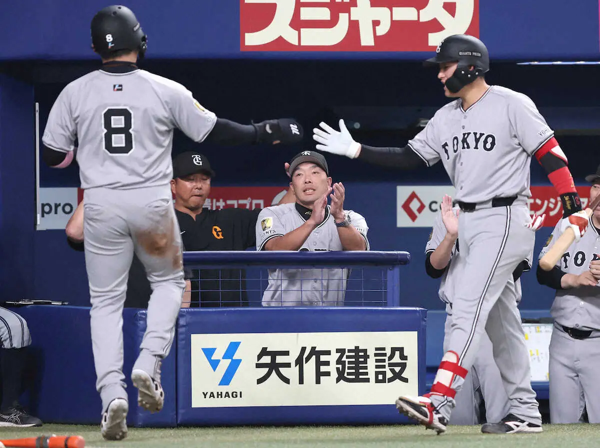 <中・巨(16)>6回、犠飛を放った坂本(左)は阿部監督とグータッチ(撮影・沢田 明徳)