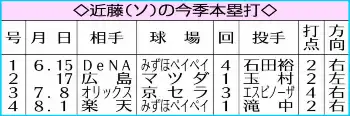 序盤で仕留める。近藤にはそんな思いがあった。楽天の先発は前回7月12日の対戦で完封された滝中。最初の打席から強く振れる球を待ち、一振りで決めた。