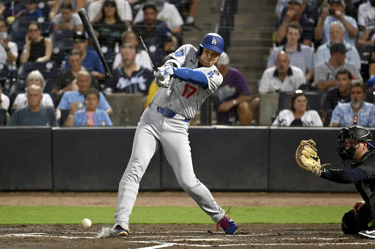 漫画のような「秘打」だ。2点リードの3回1死。右腕バズの外角に落ちるチェンジアップを打ったが、バットの先だった。真っ二つに折れたバットは約20メートルも飛んだ。メジャー平均スイングスピードの71・5マイル(約115キロ)を、大幅に上回る84・1マイル(約135・3キロ)の怪力スイングが生んだ。人気野球漫画「ドカベン」で、殿馬一人がバットを折りながら安打する「秘打・花のワルツ」があるが、大谷はさながら「秘打・怪力バット飛ばし」。タイプは違えど同じ2番打者の殿馬のような「秘打」だった。