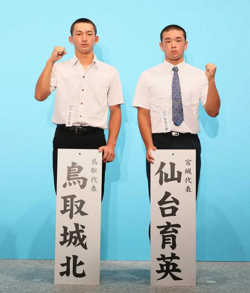 対戦が決まった鳥取城北の平山暖也主将(左)と仙台育英の佐々木義恭主将