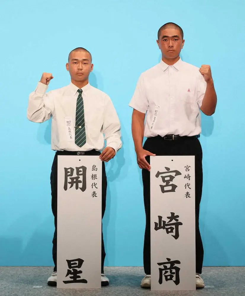 対戦が決まった開星の藤江来斗主将(左)と宮崎商の水谷友哉主将