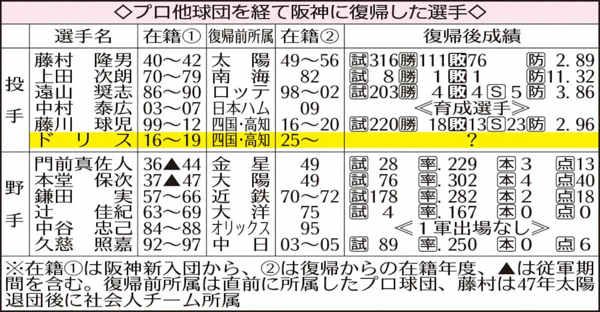 過去の阪神復帰選手を調べると歴史は古く、1リーグ時代49年の藤村隆男が投手の第1号。「ミスタータイガース」藤村富美男の弟で、42年招集による退団。46年パシフィック(太陽)移籍。社会人チームを経て49年の復帰後は56年までの8年間で6年連続2桁を含む111勝を挙げた。