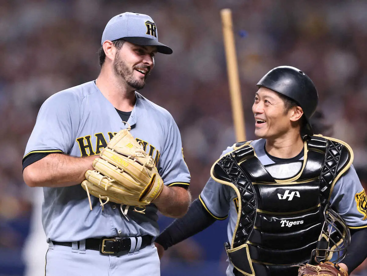 【赤星憲広 視点】0―2の7回に阪神・ハートウィグが初登板したが3連続四球で無死満塁。武器であるスイーパーは曲がりが大きくて外に外れていた。ここで捕手の坂本が、体は真ん中なのに左手を伸ばしてミットは極端に右打者の内角に構えた。ここを目がけて、ここから曲げるんだよという意思表示。これが功を奏してストライクが入るようになり山本をそのスイーパーで空振り三振、続く石伊を三ゴロ併殺で無失点に抑えた。この回に失点していれば直後の佐藤輝の逆転3ランもあったかどうか、敗色濃厚は間違いなかった。