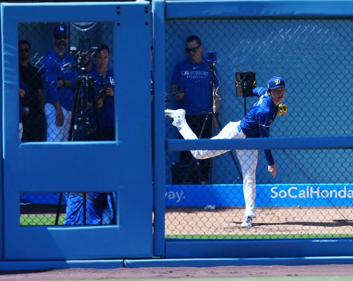 <ドジャース・カージナルス>ブルペンで投げる佐々木(撮影・小海途 良幹)