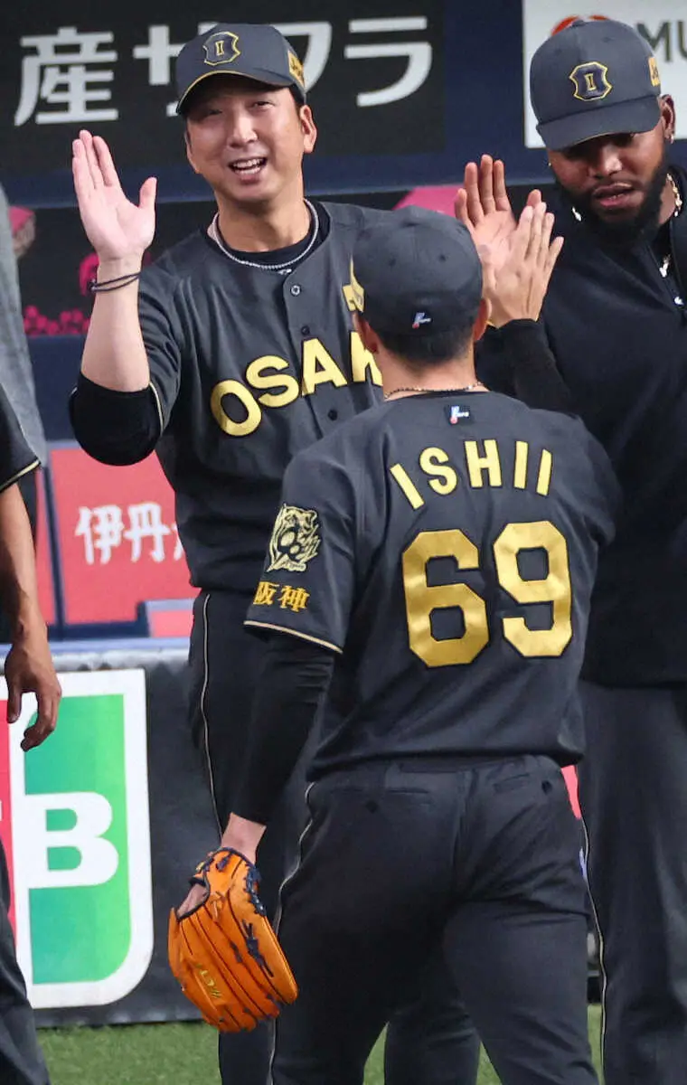 <神・ヤ(18)>9回、試合に勝利し、石井とタッチを交わす藤川監督(撮影・岸 良祐)