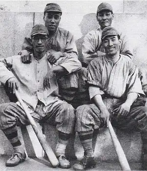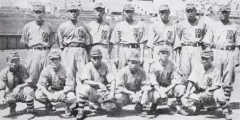 阪神1944年優勝メンバー=『阪神タイガース 昭和のあゆみ』より=。後列右から3人目が辻源兵衛、右端が監督兼任の若林忠志、左から2人目が藤村富美男。帽子は軍帽、胸の文字は「阪神」。