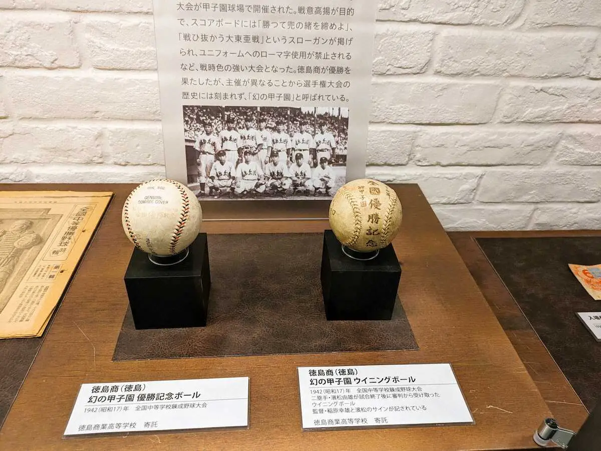 甲子園歴史館に展示されている徳島商の「幻の甲子園」優勝ウイニングボール