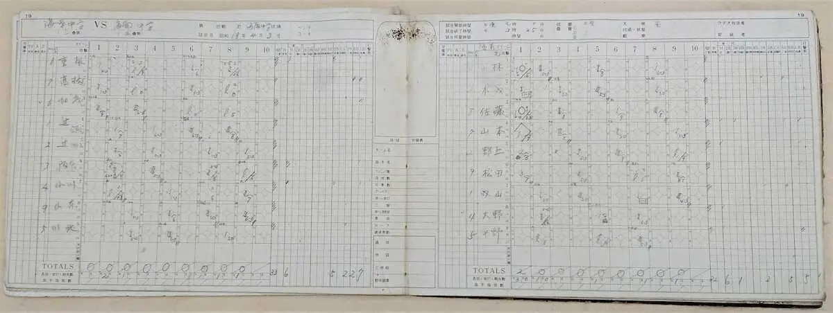 海草中スコアブックに残る戦前最後の試合、1943年4月3日、海南中戦のスコアシート。辻源兵衛は4番投手=向陽高校所蔵=