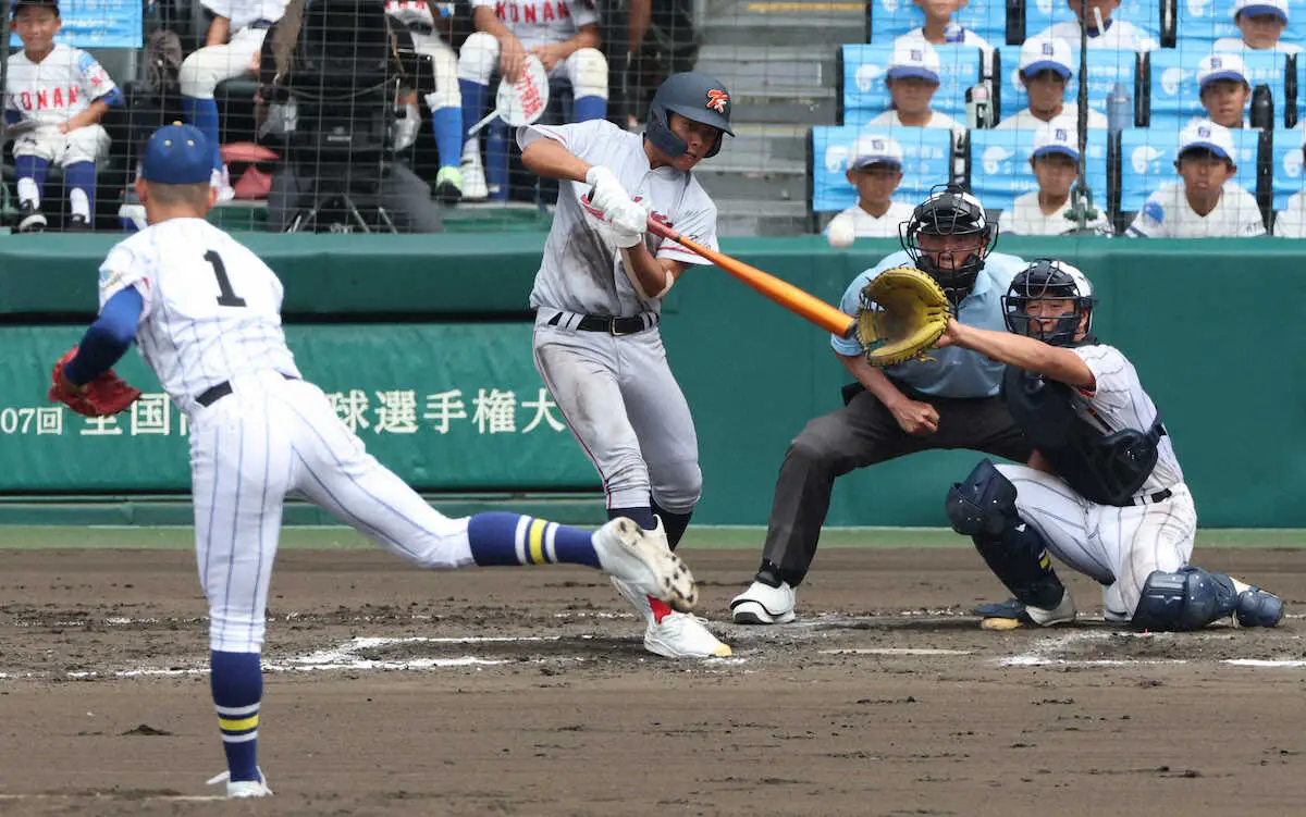 最初の打者・清水詩太(3年)の初球に153キロが計測されると、甲子園がどよめいた。2球目は154キロで、3球目のカットボールで空振り三振。次打者の山口桜太(3年)の初球にも154キロ、カウント2―2からファールとなった5球目に155キロを出した。山口にはスライダーをとらえられて右前打を許したが、猪股琉冴(3年)を投ゴロ併殺に仕留めて無失点で切り抜けた。8回、尾角凌(3年)の初球にも155キロを計測した。
