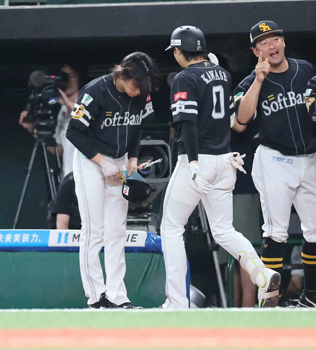 <西・ソ>5回、2ランを放った川瀬に頭を下げる先発・大津(撮影・篠原岳夫)