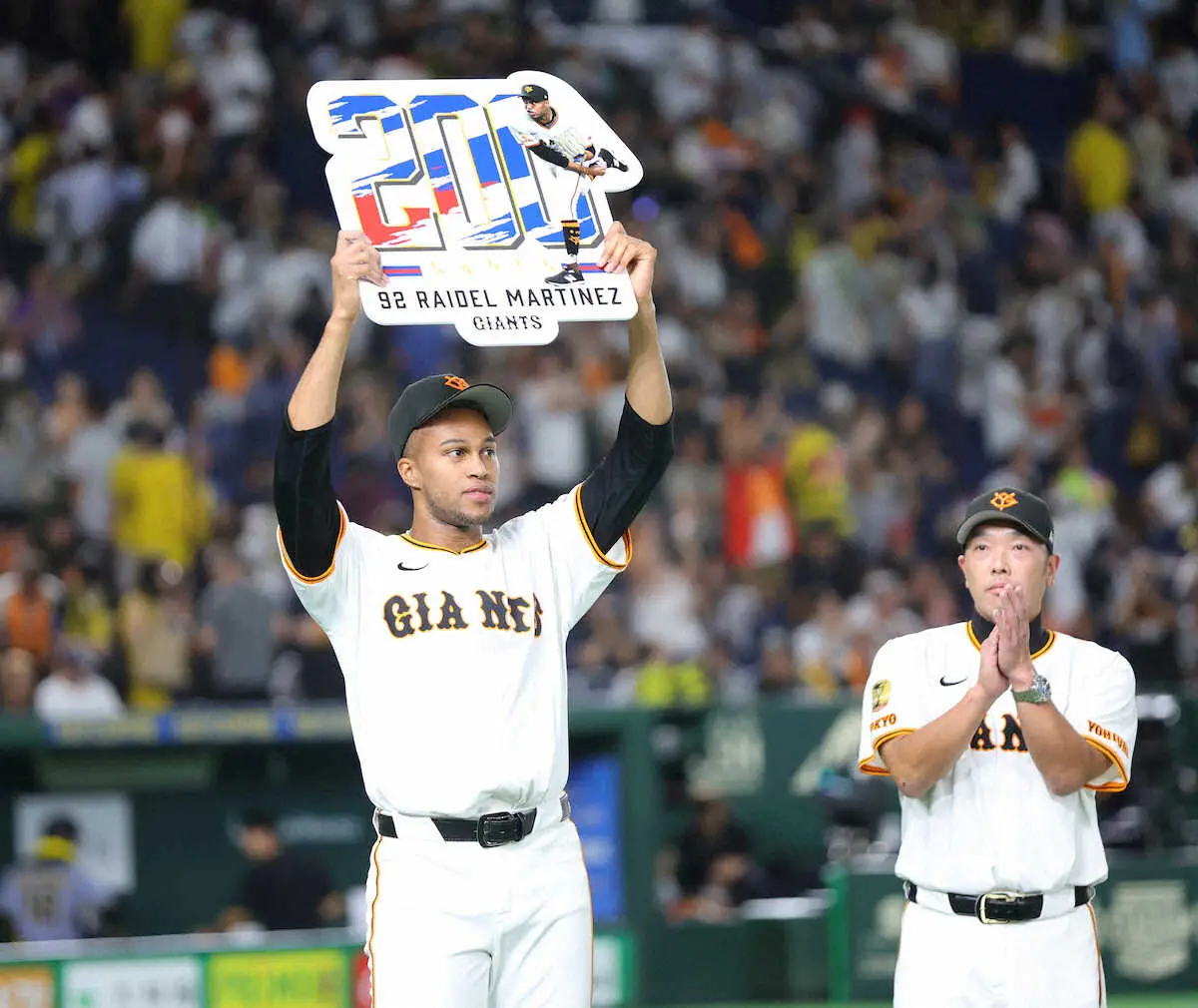 <巨・神(19)>通算200セーブを達成しボードを掲げるマルティネス(撮影・白鳥 佳樹)