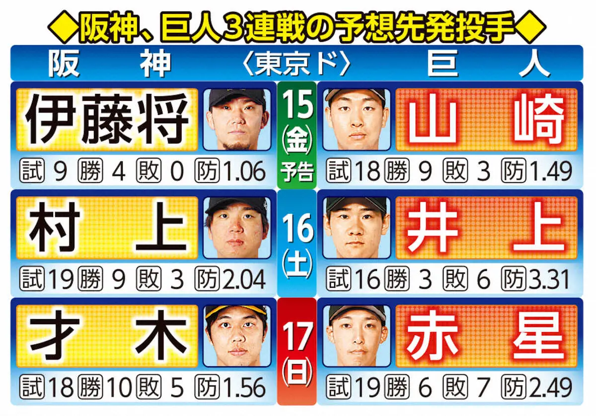 16日は村上が先発する予想。前回7月19日巨人戦では6回2安打無失点。今季は3戦2勝、防御率0・86と好相性の相手から勝ちを得る。対する巨人は井上が先発する見込みだ。
