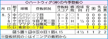 ハートウィグは過去4試合のうち3試合が負け試合、1試合が同点の場面だった。リードした場面で初めて起用した藤川監督は「期待というか、打線の並びを見てですけど」と甲斐、リチャードらの右打者を見越して投入したことを明かした。
