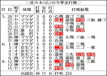 佐々木は1軍で出場を重ねながら、日々成長を遂げている。この夜も一定の存在感を示した。3回先頭で迎えた第1打席だ。先発・高梨がカウント1―2から投じた甘いフォークを中前へ運び、3試合連続で「H」ランプをともした。