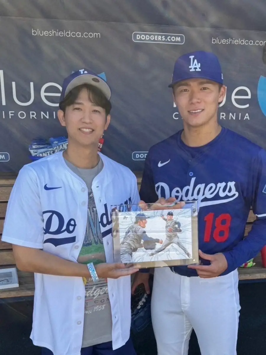 ドジャース山本由伸(右)に絵画をプレゼントした田村大さん(田村さん提供