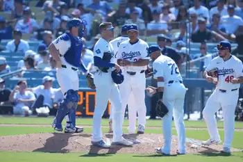 <ドジャース・パドレス>8回、マウンドに向かうドジャース・ロバーツ監督(中央)(撮影・小海途 良幹)