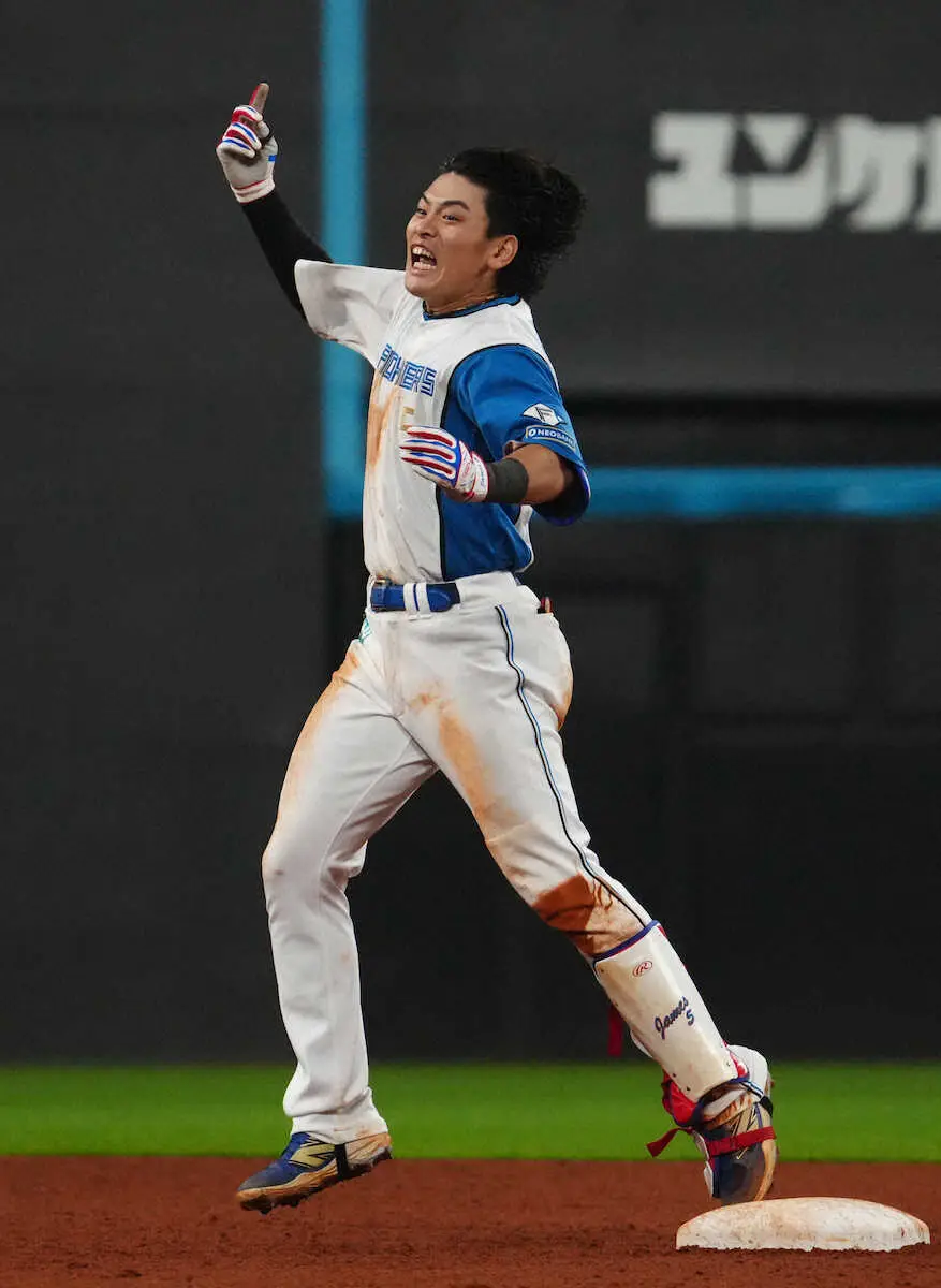 二塁ベース上で一塁走者・郡司の本塁生還を見届けると、ヘルメットを真上に放り投げて喜びを爆発させた。