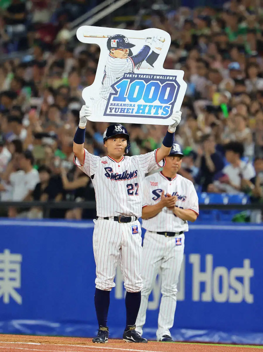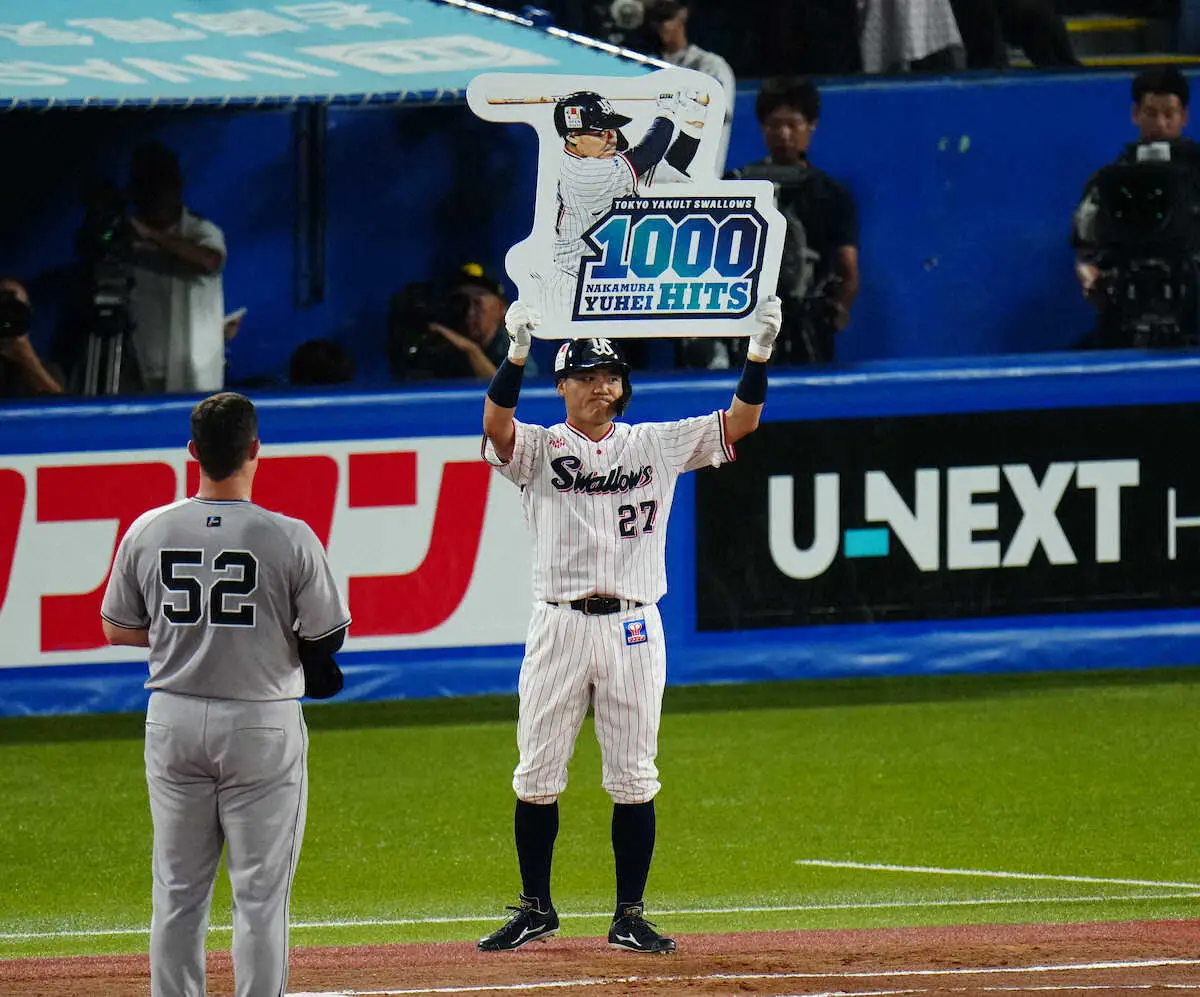 <ヤ・巨>3回、通算1000安打を達成し、つばみからボードを受け取る中村悠(撮影・光山 貴大) Photo by スポニチ ヤクルト・中村悠平 通算1000安打達成 球団捕手では大矢、古田に続き3人目 ギャラリーで見る この記事のフォト 2025年08月21日の画像一覧 もっと見る 2025年08月21日の画像をもっと見る