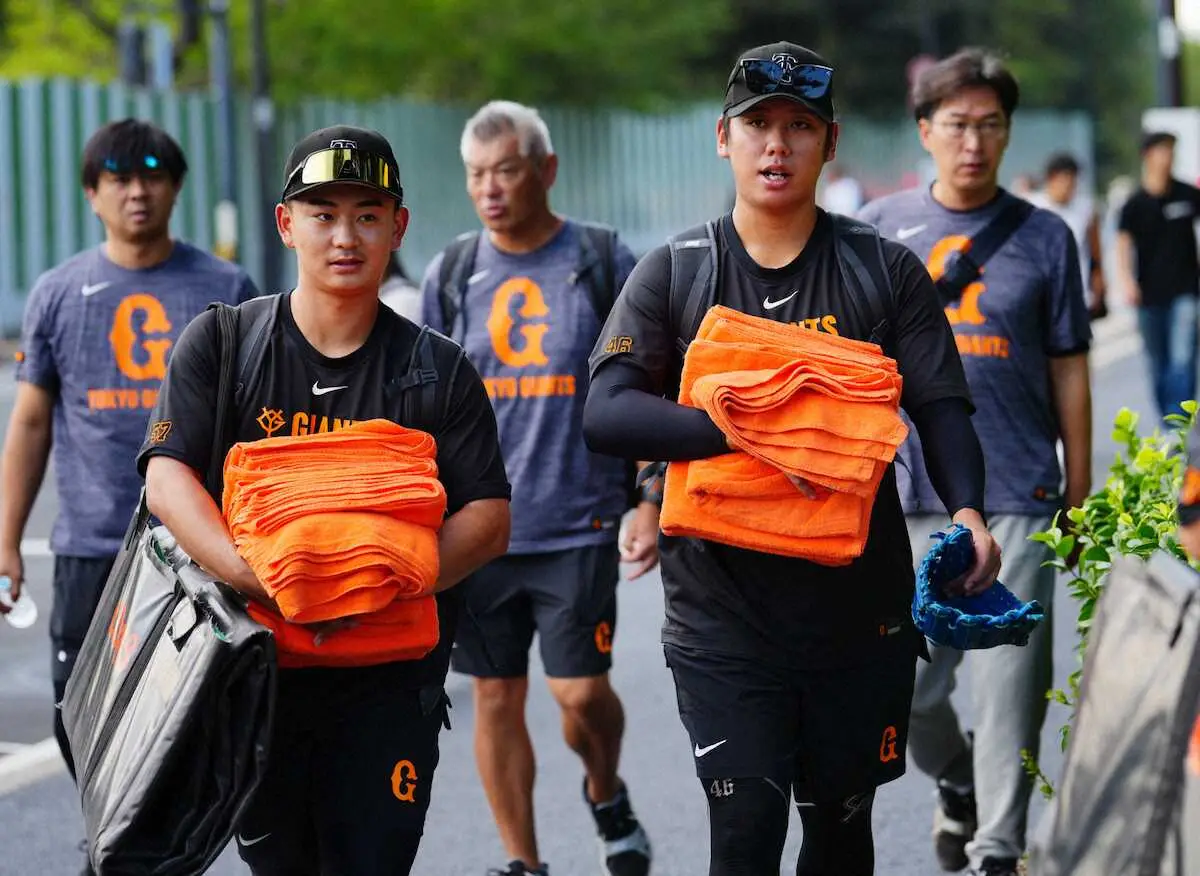<ヤ・巨>練習場に向かう宮原(左)と又木(撮影・木村 揚輔)