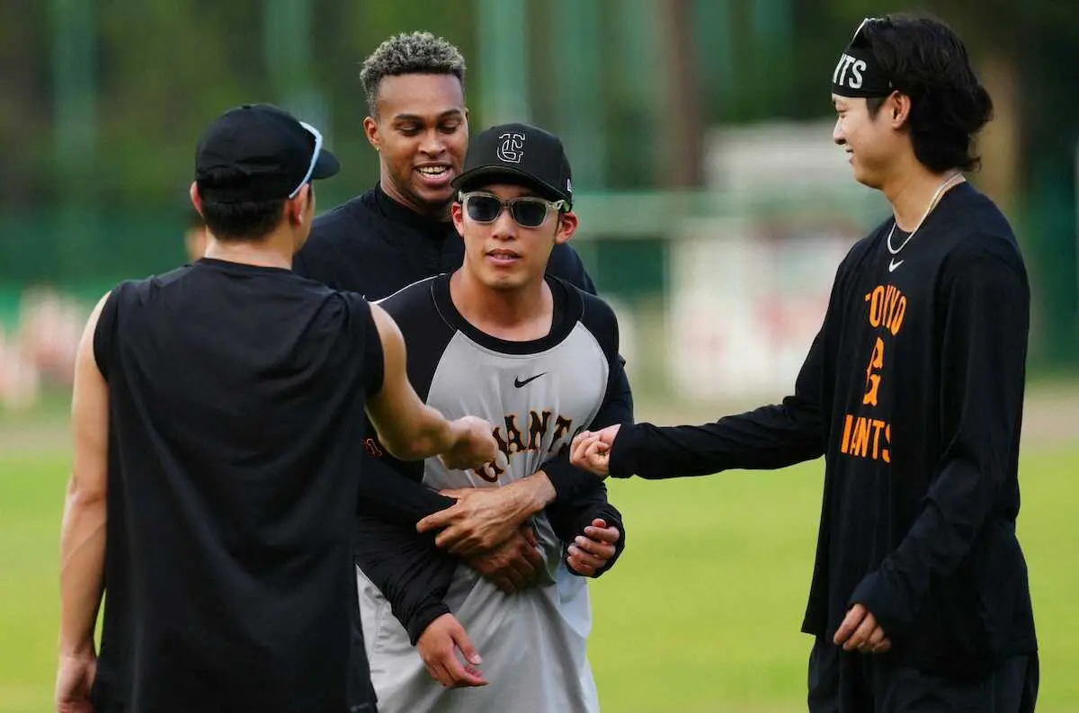 <ヤ・巨>試合前のウオーミングアップでマルティネスに捕まる赤星(中央)=撮影・木村 揚輔