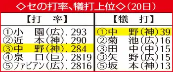 ○…中野(神)が7試合ぶり32度目のマルチ安打。目下リーグ3位の打率・284は、トップの小園(広)と9厘差に迫る。一方で犠打39は2位の菊池(広)に23差の断トツトップ。中野がシーズン首位打者と最多犠打を両方達成なら、プロ野球史上初の快挙となる。なお過去には、79年ミヤーン(大洋)が首位打者で犠打2位。62年近藤和彦(大洋)、70年安藤統夫(神)、10年平野恵一(神)の3人が打率2位で最多犠打のケースがあった。