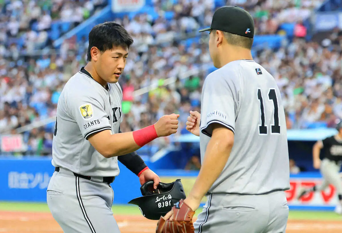 左翼手・内山が打球の処理にもたつく間に一走・泉口は一気に本塁へ。余裕を持って先制のホームを踏んだ。二塁上で岡本はベンチに向かって笑顔。イニングが終わるとベンチ前で田中将とグータッチを交わした。
