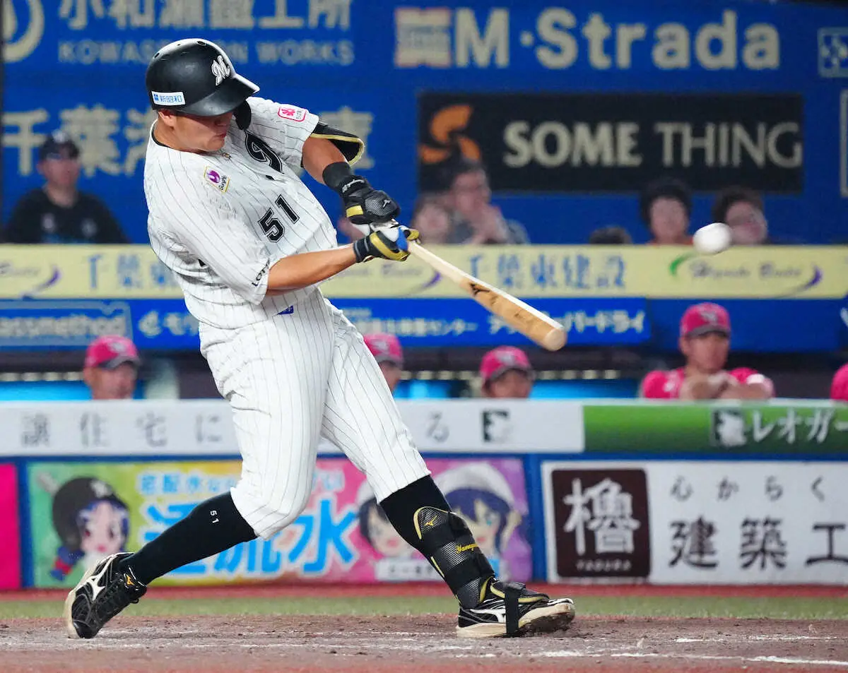 夏の恒例イベント「マリーンズ夏祭」開催中のZOZOマリン。ド派手な花火を連続して打ち上げた。2試合連続の「4番・DH」に応え、初回2死三塁では滝中の内角高め145キロのシュートを左翼席中段へ先制2ラン。1点差に迫られた4回無死一塁、今度はフォークをすくい上げて左中間へ特大の2ランだ。さらに打者一巡して2死一、三塁で再び打席が回り、代わった柴田の148キロの直球をライナーで左翼席最前列へ3ランを打ち込んだ。22年9月22日のオリックス戦以来3年ぶりの1試合3発。「奇跡です」と笑った。