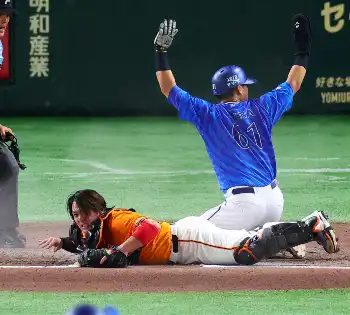 やや一塁側に逸れた送球をキャッチした甲斐は懸命にミットを伸ばし、ヘッドスライディングしてきた蝦名にタッチ。その際、甲斐の右手が蝦名の腹に当たって複数本の指が反対方向に反り返る形となった。