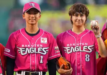 23日の楽天-オリックス(楽天モバイルパーク)のセレモニアルピッチにHey!Say!JUMPの八乙女光が登場。捕手役の宗山を相手に左腕からノーバウンド投球を披露した。