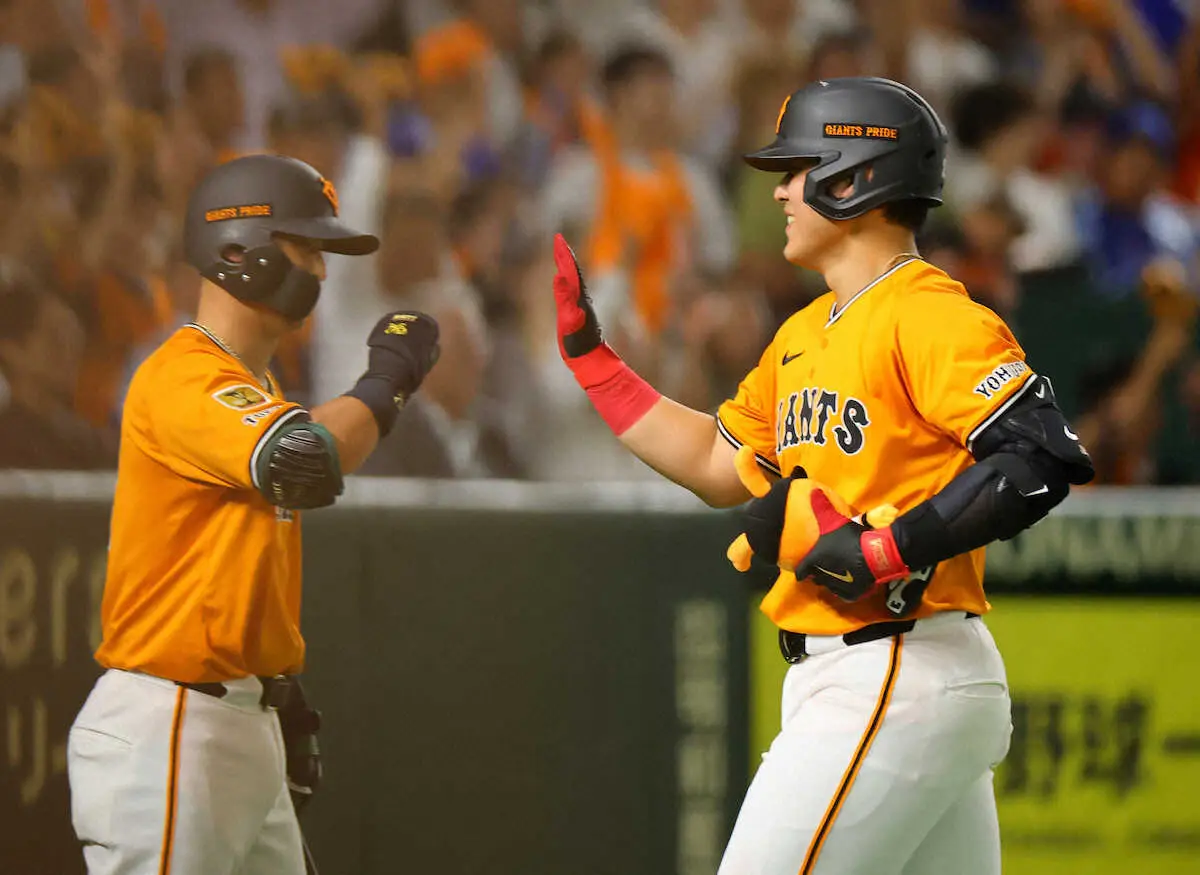 <巨・D>3回、先制ソロを放ち、吉川(左)に迎えられる岡本(撮影・光山 貴大)