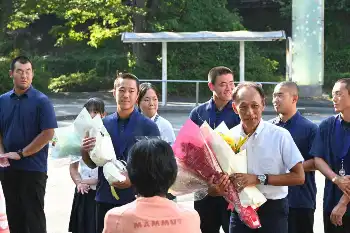 【甲子園】準優勝の日大三ナインが笑顔で学校到着 バレー部、学校関係者ら約150人がお出迎え