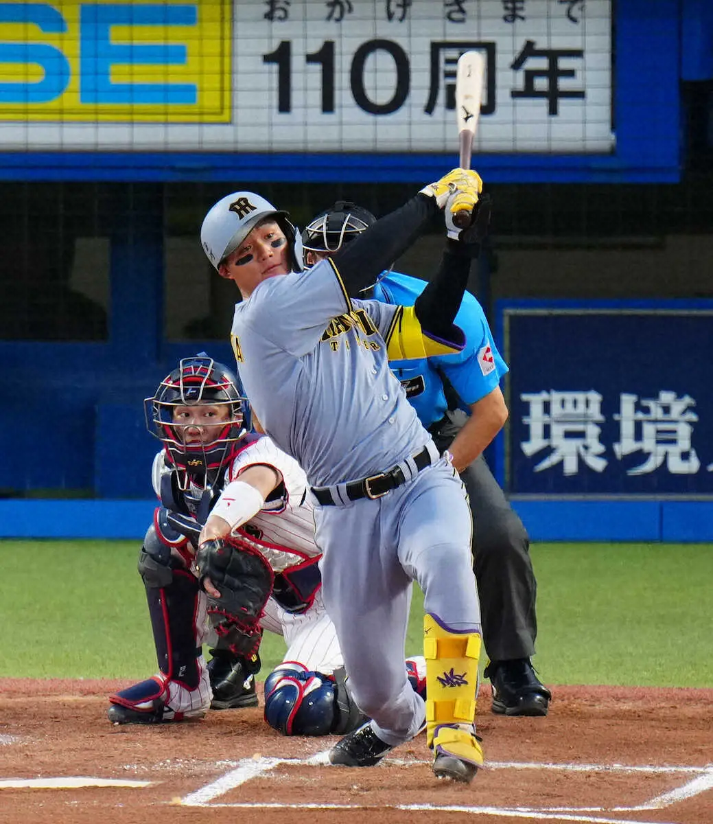 低弾道で飛び出した白球は瞬く間に左翼席の最前列に着弾した。16日の巨人戦以来5試合ぶりの一発は今季18号の先制2ラン。ヤクルト戦ではカード別で最多の通算11本塁打と伸ばし、初回からお祭り騒ぎとなった三塁側の虎党を横目に、ダイヤモンドを一周した。