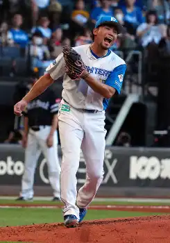 <日・ソ22>5回、周東を空振り三振に仕留め雄叫びをあげる伊藤(撮影・高橋 茂夫)