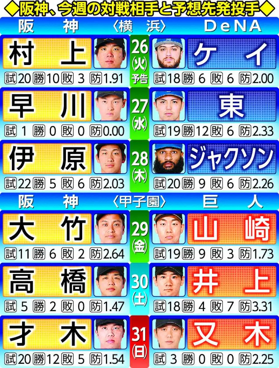 26日DeNA戦、先陣を切るのは村上だ。ローテ再編に伴い、中9日を空けてカード頭を託された。「(間隔)空けてもらっているので、言い訳はない。万全で臨める」と気合い十分。まずはここで1勝し、早川、伊原のルーキーコンビにバトンを渡したい。対するDeNAはケイが先発。今季は阪神戦で5戦未勝利ながら防御率0・82としている。