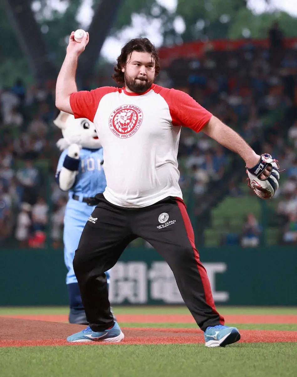 「ライオンマーク」つながりの新日本プロレスのTシャツ姿でマウンドの少し手前から豪快なノーバン投球。