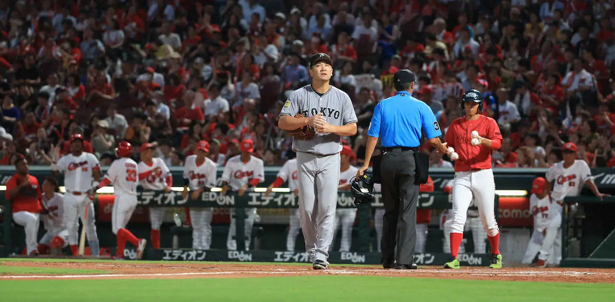 3安打に2四死球、失策と暴投でこの回4失点(自責3)。3回の攻撃、先頭で田中将の最初の打席が回ってきたところで阿部監督は降板を選択。代打・浅野を告げた。