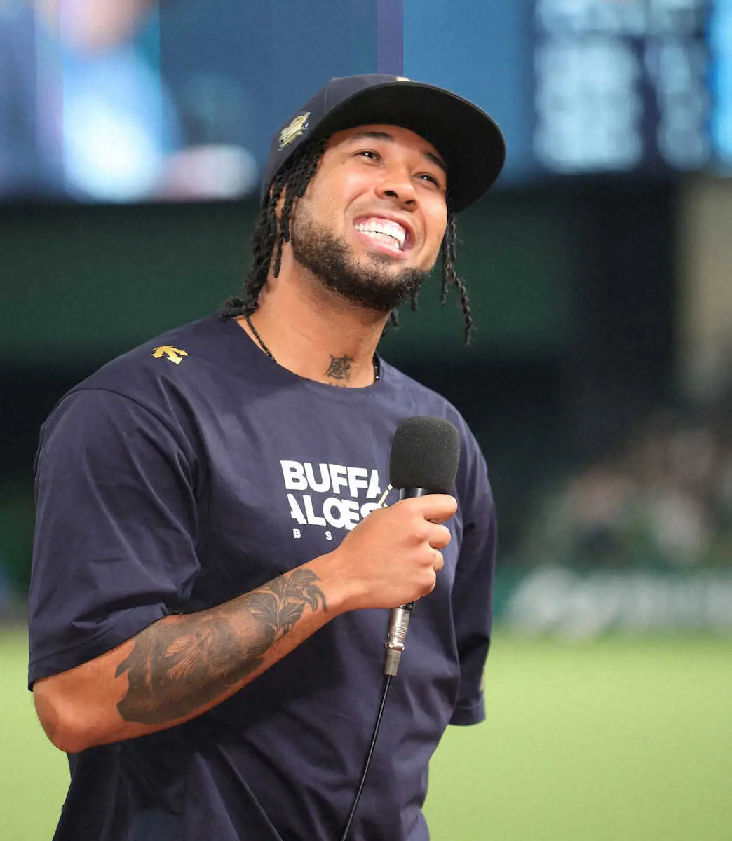 <西・オ>試合後、流ちょうな日本語であいさつして球場を沸かすエスピノーザ 撮影・白鳥 佳樹)