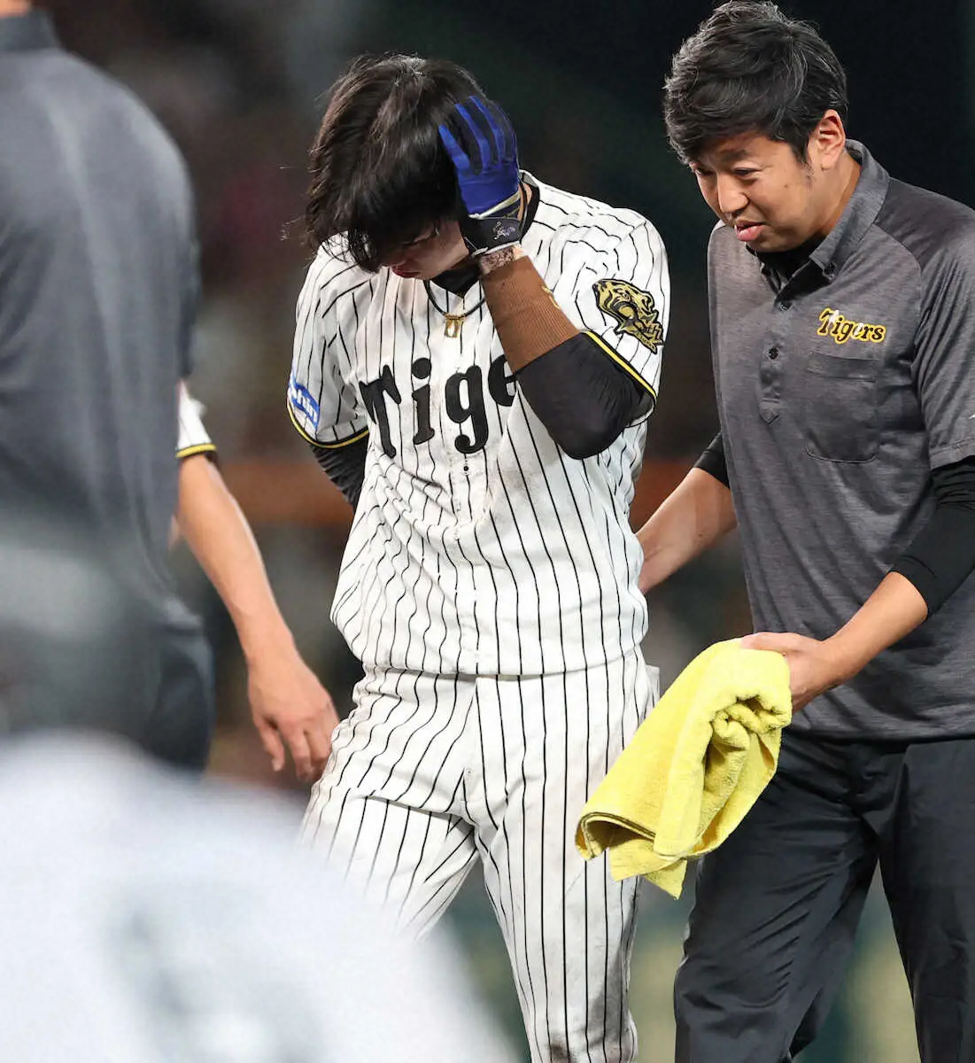 9回2死満塁で三塁・佐藤輝の送球を捕球にいった際に一塁走者で二塁を狙った浅野と交錯。苦悶(くもん)の表情を浮かべてその場に倒れ込んだ。自らの足で歩いてベンチへ戻ったものの、二塁には植田が入った。