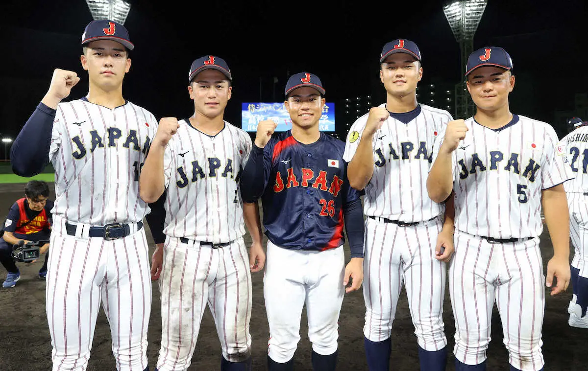 <U-18高校日本代表・侍ジャパン大学日本代表>記念撮影する(左から)奥村頼、奥村凌、緒方、阿部、為永(撮影・松永 柊斗)