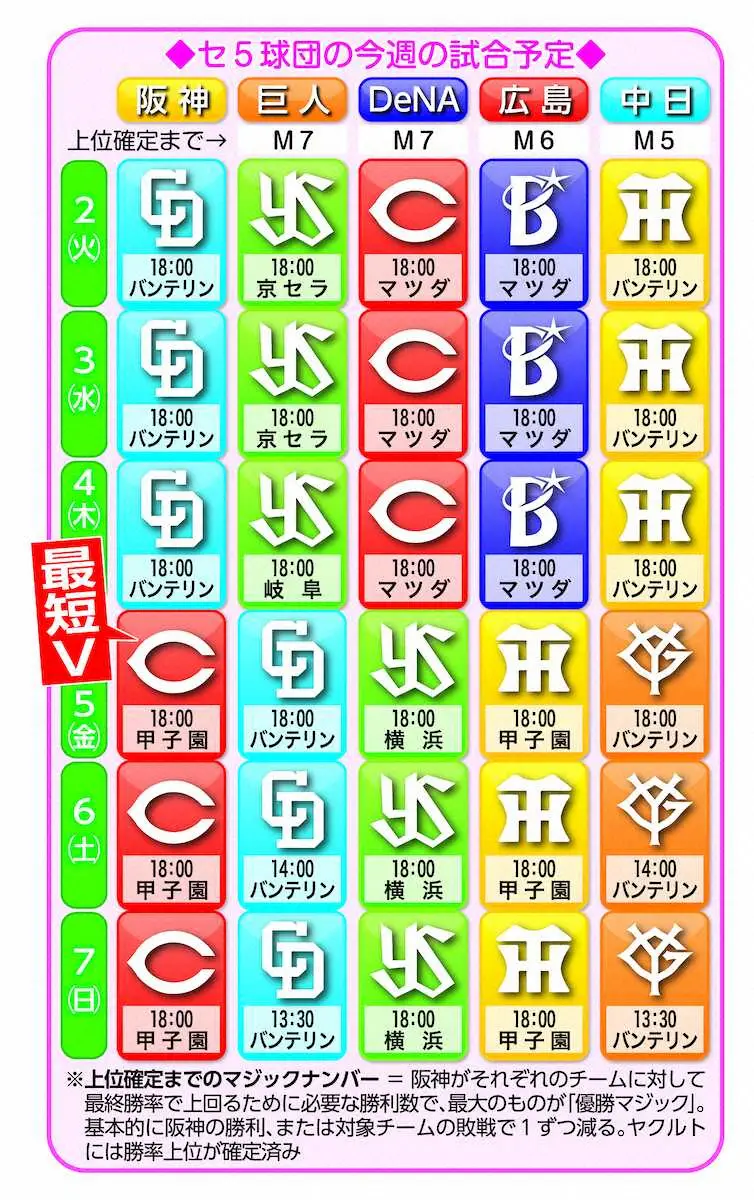 ○…目下2位・巨人と3位・DeNAに対して「M7」が点灯中だが、単純に5日まで阪神4連勝、巨人とDeNAが4連敗した場合は、阪神の優勝は決まらず、広島に対して「M1」が残る。これは別表の通り現時点で阪神が巨人、DeNA、広島、中日の4球団に対して最終勝率で上回るための「上位マジック」がM7~5と拮抗(きっこう)しているため。5日に優勝を決めるためには、2~4日の広島―DeNA戦でDeNAの1勝2敗など、勝敗を分け合う必要がある。