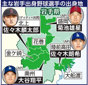主な岩手出身選手の出身地 Photo by スポニチ エンゼルス・菊池雄星が語る 岩手発メジャーへの道 ドジャース・大谷、… ギャラリーで見る この記事のフォト 2025年09月03日の画像一覧 もっと見る 2025年09月03日の画像をもっと見る